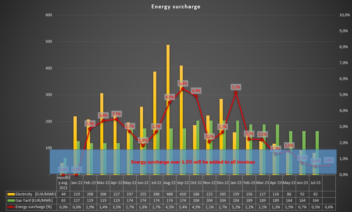 La forte augmentation des prix dans le secteur de l'énergie a entraîné des coûts supplémentaires dans notre fabrication. Afin d’intégrer équitablement ces coûts énergétiques volatiles dans notre structure de prix, nous avons décidé de répercuter ces coûts variables sur nos ventes, au moyen d'une surcharge énergétique "flottante".